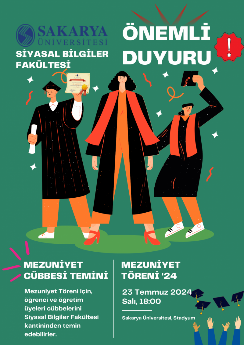 Sayın Siyasal Bilgiler Fakültesi Ailesi, 2023-2024 Eğitim-Öğretim Yılı Mezuniyet Törenimiz, 23 Temmuz 2024 Salı günü saat 18.00'de Sakarya Üniversitesi Stadyumu'nda gerçekleştirilecektir. Mezuniyet töreni için ihtiyaç duyulan cübbeler, öğrenci ve öğretim üyeleri tarafından Siyasal Bilgiler Fakültesi kantininden temin edilebilecektir. Bilgilerinize sunulur. SAÜ Siyasal Bilgiler Fakültesi Dekanlığı