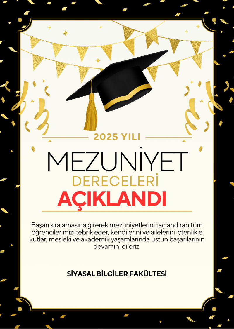 Sakarya Üniversitesi Siyasal Bilgiler Fakültesi bünyesinde 2024-2025 Eğitim-Öğretim yılı sonunda mezun olan öğrencilerin bölüm ve fakülte genelinde gösterdikleri akademik başarılar neticesinde elde ettikleri derece sıralamaları belirlenmiştir.